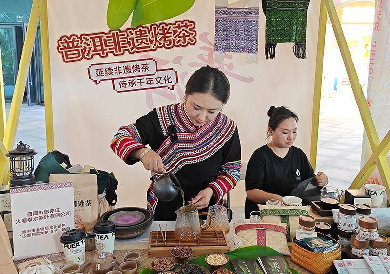同时,少数民族歌舞展演轮番上演,悠扬的歌声与灵动的舞姿展现普洱民族风情。在“普品入沪”展销区,集中展销普洱茶、咖啡、七彩花生等高原特色农产品,以及佤族织锦、手工艺品、文旅产品等系列文创产品,既满足多样化消费需求,又实现文化展示与产品推广的双向联动。